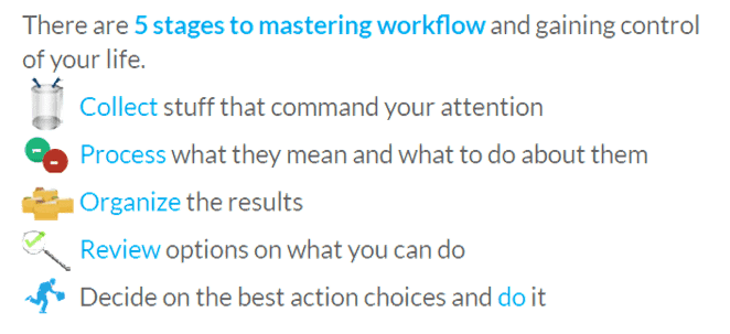 - You start by collecting everything big or small that could require your attention and put them in one place (so you know it is “safe” and you can find it any time). This could be a physical place (like notes/ slips in an in-basket) or a digital place (like an organizational tool/ app).