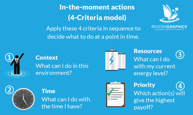 As and when you find yourself with some spare time on your hands (e.g. when a meeting is cancelled or while waiting for a bus), rather than start doing the first item that comes to mind, identify the best item to work off your “Next Actions” list, using this 4-criteria model: