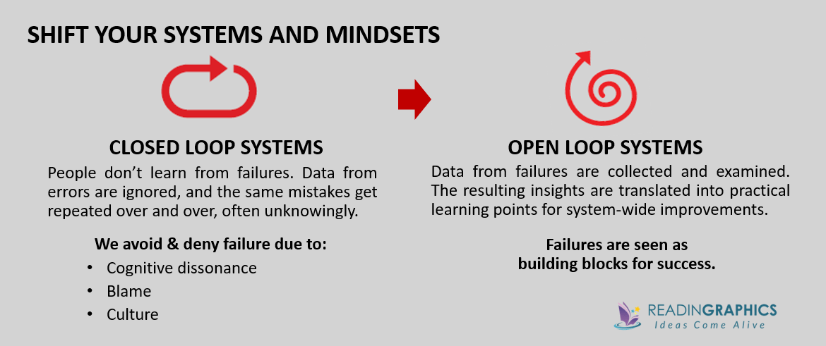 Closed loops are usually sustained by (i) people hiding their mistakes, (ii) reframing/justifying their errors, and (iii) interpreting data in a biased way. In our complete Black Box Thinking summary, we explain in detail on how to overcome these challenges.