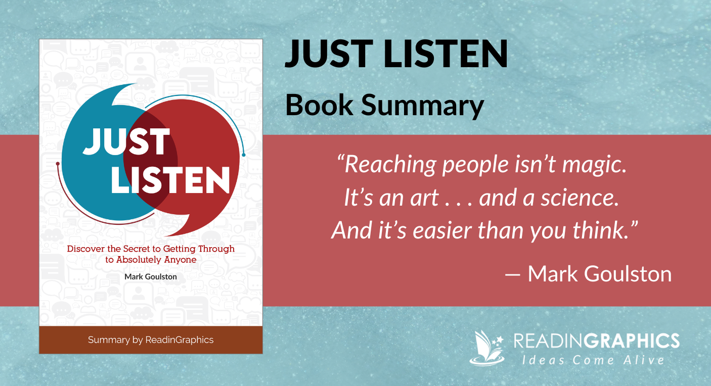 Just Listen: Discover the Secret to Getting Through to Absolutely Anyone is written by Dr. Mark Goulston–a psychiatrist, executive coach, consultant, TV personality and CEO of the Goulston Group. He was a UCLA professor of psychiatry for over 25 years, and a former FBI and police hostage negotiation trainer. After starting his private practice, his expanded into consultancy, speaking and coaching. Goulston has written several books, hosted and co-hosted several radio shows and podcasts, appeared in and contributed to hundreds of major media, and also serves on the Board of Advisors of a few companies. He received his B.A. with a major in Zoology from the University of California, Berkeley, and his M.D. from the Boston University School of Medicine (BUSM).
