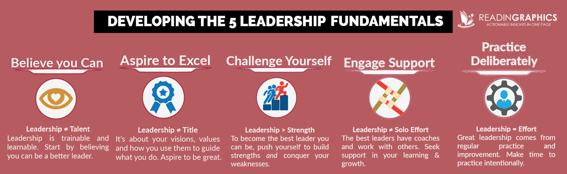 Ready to take charge of your leadership development and learn more about each of these 5 fundamentals in more detail? Get specific tips and self-coaching actions to start start developing your leadership fundamentals with our complete book summary bundle which includes an infographic, a 15-page text summary, and a 27-minute audio summary.