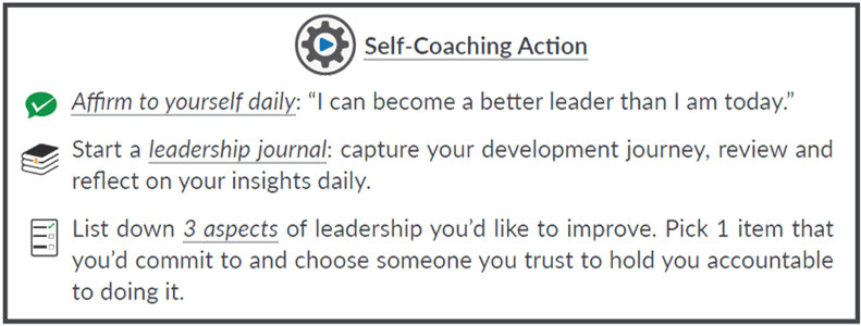 There are specific practices that are universally associated with exemplary leadership. The challenge is to use them frequently, so you can get more confident about them. We’ll now take a brief look at the 3 leadership fundamentals, with the associated self-coaching tips. You can get more details from our full 15-page summary.