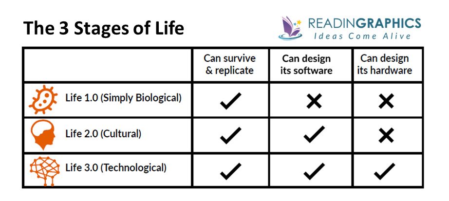 Tegmark categorizes life into 3 stages in order of sophistication: