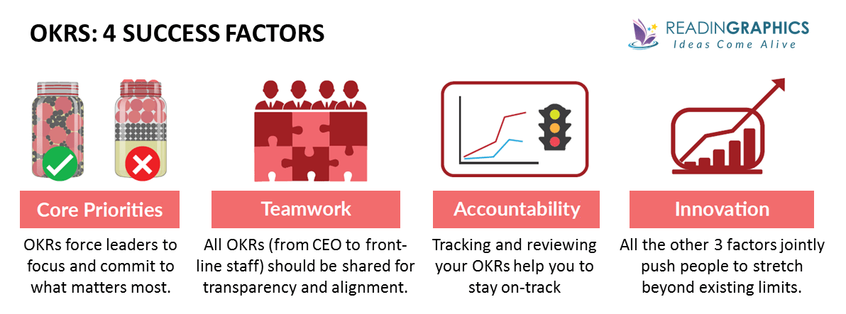 Here’s a quick overview of the 4 key success factors that allow OKRs to translate ideas into results. For specific tips and examples for each of these components, do get a copy of our full 12-page summary for more details.