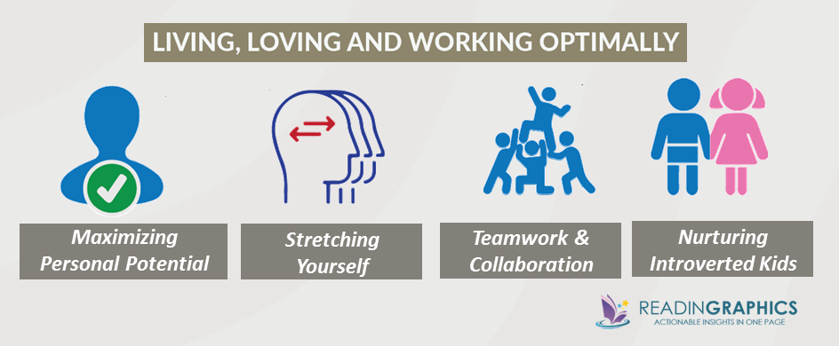• Maximizing Personal Potential. To be at your peak performance, seek to operate from your sweet spot, and occasionally stretch yourself when the situation requires it. Check out the Quiet summary bundle for details on how to find your “sweet spot”, push yourself out of your comfort zone without overstretching, manage your thinking, close communication gaps and create the right social setting where everyone can enjoy themselves.