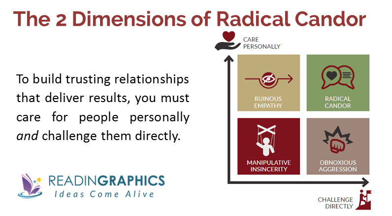 Radical Candor is about building such trusting relationships by working concurrently on 2 dimensions: