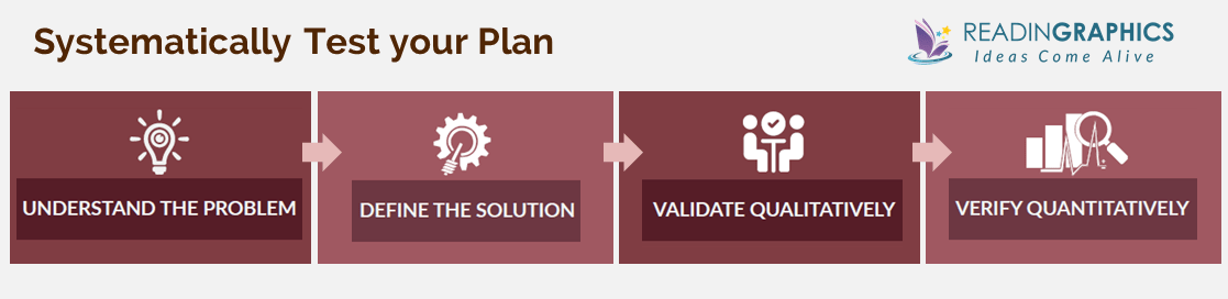 • Details of the 4-part testing process to systematically test the 9 components of your business plan in phases. These include: (i) Understand the Problem => (ii) Define the Solution => (iii) Validate Qualitatively => (iv) Verify Quantitatively (then repeat the loop);