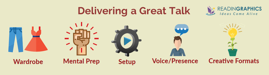 Now that you have a great idea (with a concise throughline and coherent parts) which you have prepared in detail, you’re now ready to deliver an amazing talk. The 16-page version of our TED Talks summary includes numerous tips on what to wear, how to prepare your setup and your physical/mental space, how to use your voice/presence to deliver your message most effectively and creative formats you can consider to make your talk stand out even more.
