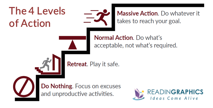 Generally, there are 4 levels of action that all of us use at some point in our lives, though most people stay at the first 3 levels most of the time. To achieve massive results, you need to take massive (Level 4) actions. Here’s an overview of the 4 levels of action. Do get more details from our full 12-page summary.