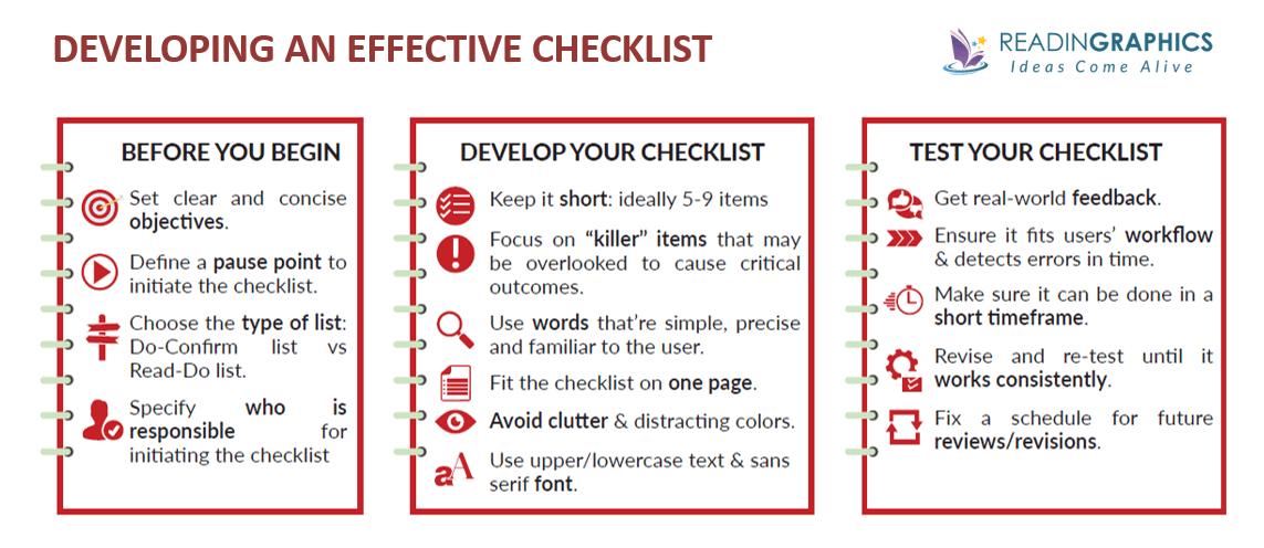 Effective checklists aren’t developed in an ivory tower or office–they must be developed with real-world analysis, testing and revisions. In our complete 13-page summary, we zoom in further on how to draft effective checklists in 3 parts: (i) pre-planning, (ii) developing the checklist and (iii) testing your checklist in the real-world. Here’s a quick overview: