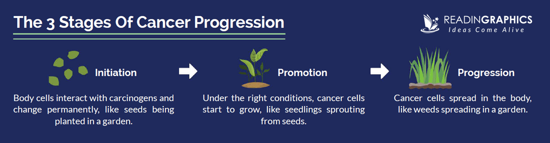 Initiation. This is the process where chemicals called carcinogens are absorbed by the body and permanently change certain cells to create a potential for cancer. Carcinogens come mainly from industrial processes and partly from nature (e.g. aflatoxin in food). This process is like planting a seed.