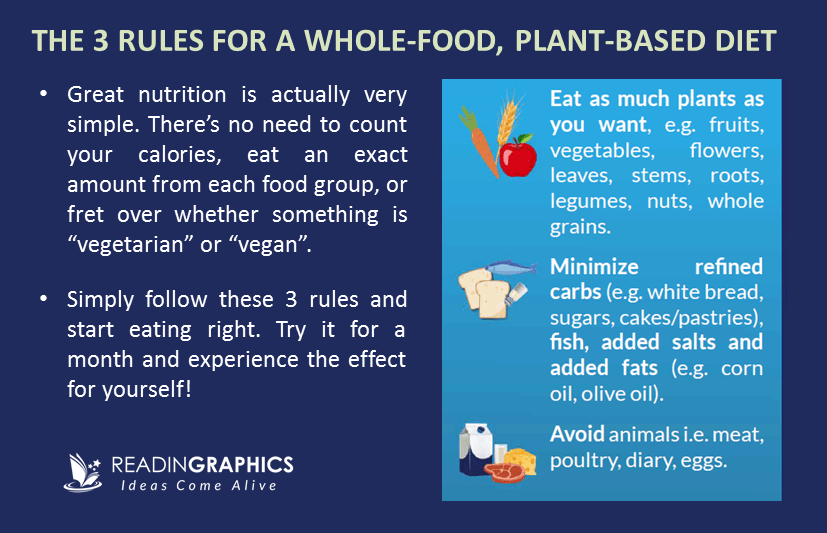 Nutrition is “food that promotes health”. By eating right, you can live longer, look younger, feel more energetic and avoid various diseases. In our full The China Study summary, you’ll learn about  (i) the 8 principles for eating right, and (ii) the 3 simple rules for a WFPB diet. Here’s a quick overview of what a WFPB diet entails: