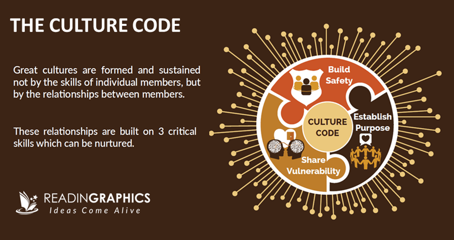 Does this apply universally for successful groups and cultures? How are great cultures built and sustained? To answer these questions, Coyle spent 4 years researching exceptionally-successful groups and comparing them with less successful ones. He found that these cultures stood out not because of the intelligence or skills of individual members, but because of their relationships. These in turn were built on 3 critical skills: (i) building safety, (ii) sharing vulnerability, and (iii) establishing purpose.