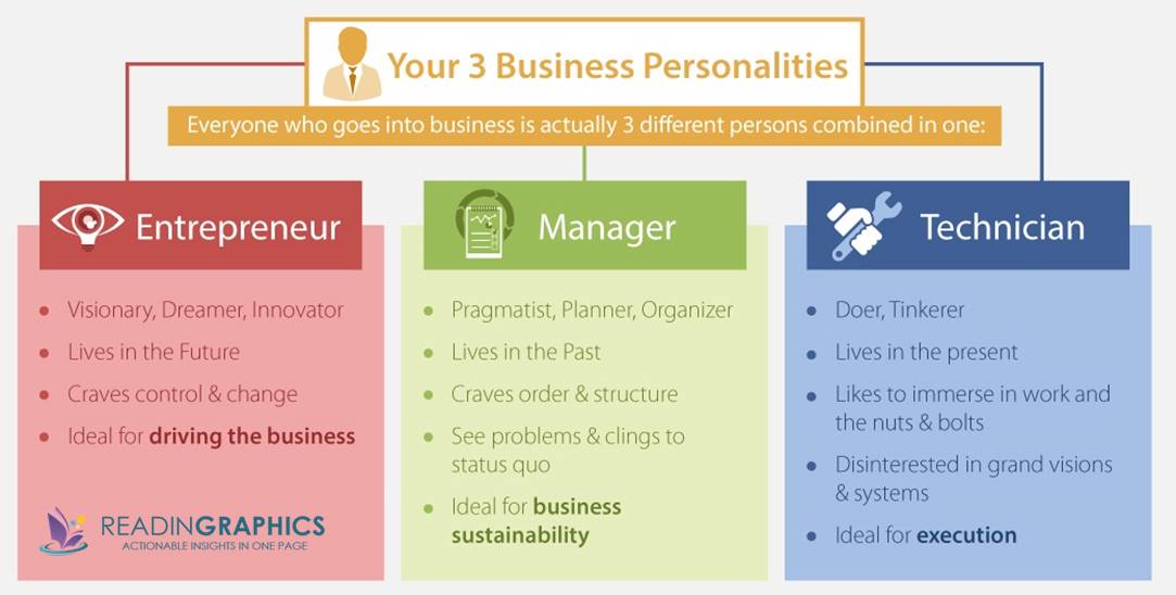 We all have multi-faceted personalities, with often-conflicting traits. A business owner is not just an entrepreneur, a manager or a technician. He is all 3 personalities rolled into one at the same time. Hence, he has to deal with their differing tendencies, needs and wants.