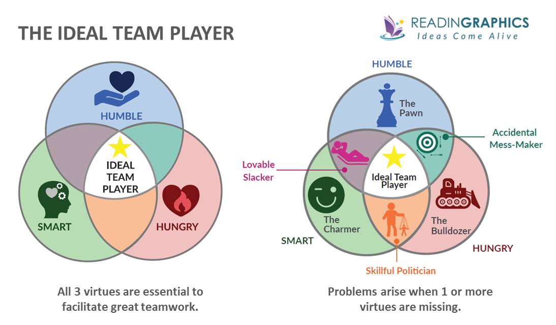 The ideal team player is humble, hungry and smart. People who have all 3 virtues are passionate about their work, go beyond their call of duty, and are willing to put the team above their own interests. They share the credit readily, make other team members feel appreciated and involved, yet are willing to hold themselves and others accountable for results and improvements.