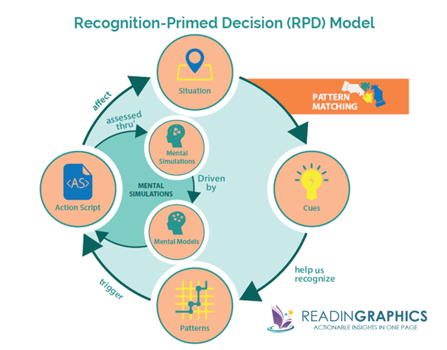 The Recognition-Primed Decision Model (RPD) explains how this works. Essentially, our brains link perceived cues to patterns and “action scripts” – this pattern-matching process allows us to call up the stored actions when we detect similar patterns. We also test our action scripts or decisions through mental simulation to assess if a specific course of action would work, as summarized in the diagram below. [Get more details on this process from our full 15-page summary]The Power of Intuition summary_Recognition-primed decision model RPDThe RPD Model helps us to make decisions without having to reconsider all our options every time. It is also the source of our “hunches”.