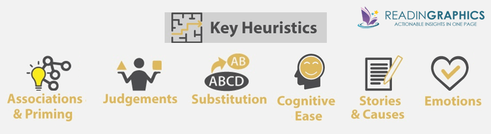 In order to quickly process the tons of stimuli that we take in daily, System 1 uses “heuristics” or mental shortcuts. These are fast, but often unreliable, and makes us susceptible to others’ suggestions or influence. Here’s are the key heuristics detailed in the book: