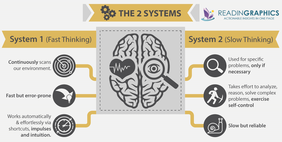 Kahneman explains how the human brain works by simplifying it into 2 systems: (fast and slow):