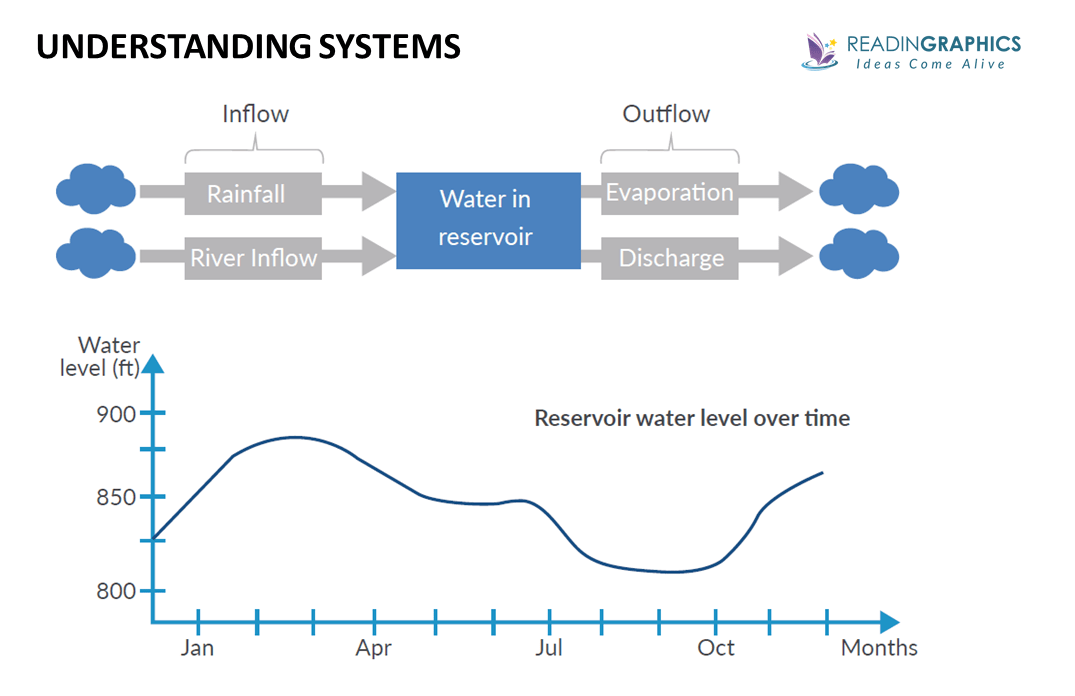 The best way to understand a system is to (i) map out a system diagram and (ii) plot the variables/stocks on a time graph. For example, the simple diagram below shows the key factors that affect the water level in a reservoir. When you examine it alongside time-graphs, you can get a better grasp of how each variable affects the water levels.