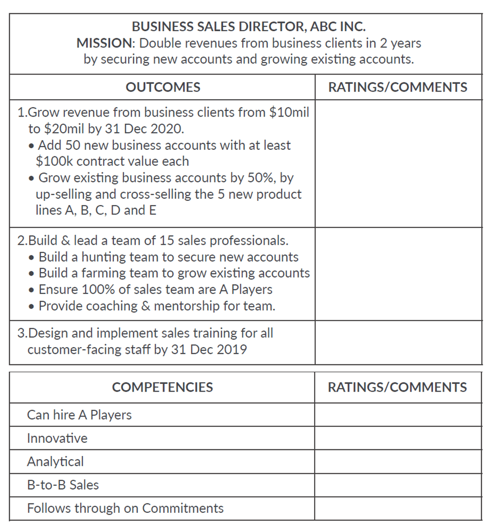 You can only build a house with a blueprint. Likewise, you can only hire the right person with a scorecard. The scorecard is a job blueprint—it describes exactly what success in a role looks like, including the (i) mission (why the role exists), (ii) outcomes (what the person must deliver) and (iii) competencies (how the job should be done given the job requirements and company culture).