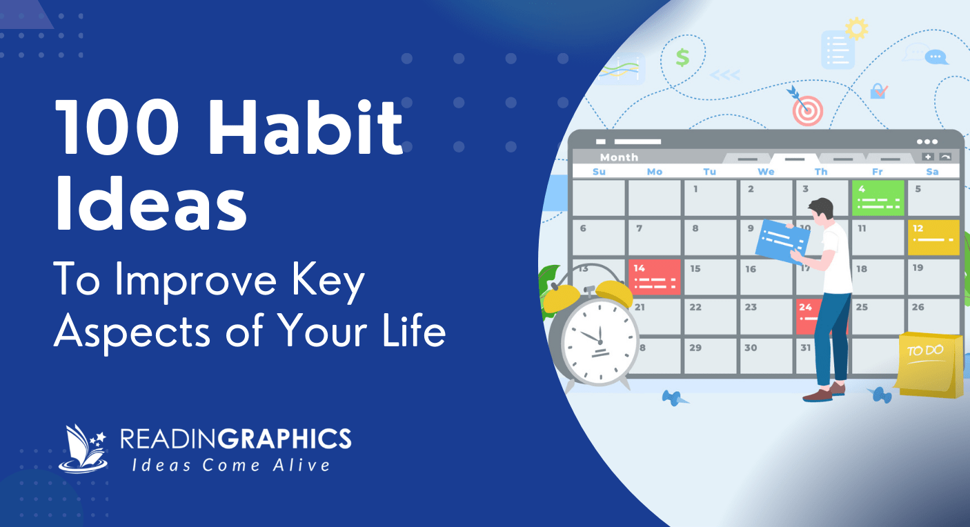 In this blog post, we will share potential habits inspired by great books in the ReadinGraphics library, along with proven tips for habit tracking and formation. These are organized into habit areas you might want to improve, with links to notable books for each area. So, your search for habits is officially over! Here’s a quick peek at the areas we’ll discuss: