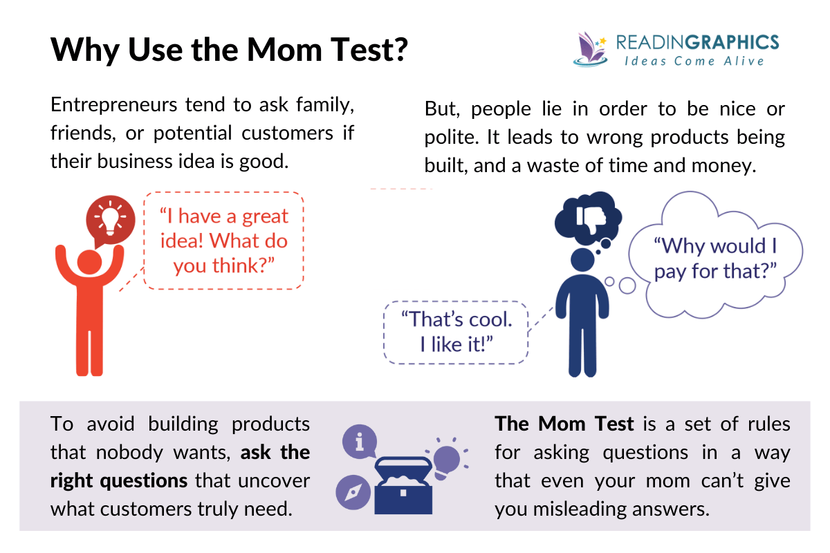 Even if your first test group is small, the key is to ask the right questions to get unbiased and valuable feedback. In Rob Fitzpatrick’s The Mom Test, he suggests that instead of asking for opinions, focus on people’s experiences.