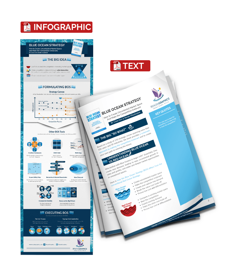 • Powerful strategies and tips e.g. how to reconstruct market boundaries by looking across 6 paths, reaching beyond existing demand with 3 tiers of non-consumers, 4 steps to developing a commercially-viable idea, and 4 components to visualize your strategy; and