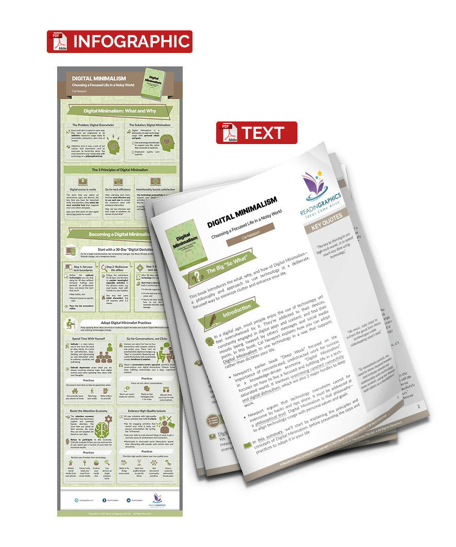 In a digital age, most people enjoy the use of technology, yet feel overwhelmed by it. Digital Minimalism is about aligning technology usage with your personal values and goals, so you can maximize the value from technology instead of allowing it to dictate your life. In this book, Cal Newport explains the why, what, and how of Digital Minimalism, to help you minimize clutter, reclaim your focus, and enrich your real-world experiences.