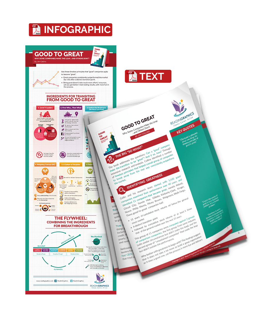 The book addresses the questions: Can a “good” company make the transition to be “great”? And if so, how? Through extensive research and analysis of some 1,435 “good” companies, Collins and his team found several timeless principles that helped a small group of 11 companies to break away from the rest and become”great”, consistently outperforming the market by at least 3 times. The 11 companies are: Abbott, Circuit City, Fannie Mae, Gillette, Kimberly-Clark, Kroger, Nucor, Philip Morris, Pitney Bowes, Walgreens, and Wells Fargo.