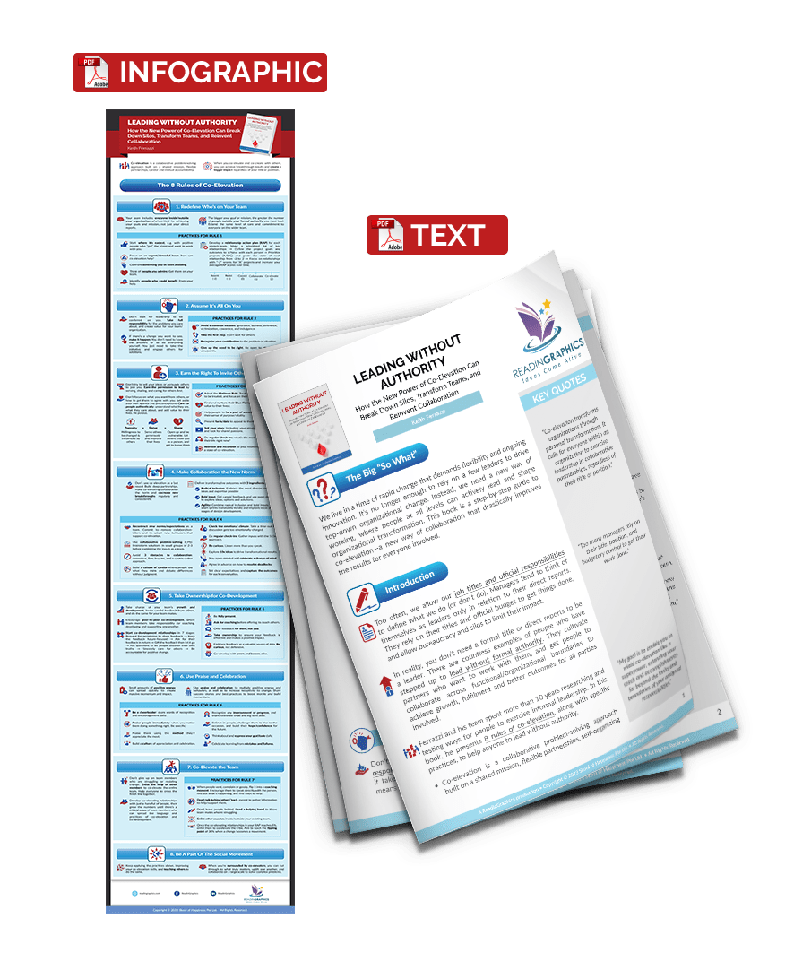 Too many people allow their job titles and official responsibilities to define what they do (or don’t do). In reality, you don’t need a formal title or direct reports to be a leader. In this book, Keith Ferrazzi shares the principles and practices of co-elevation—a collaborative problem-solving approach built on a shared mission, flexible partnerships, self-organizing teams, candor and mutual accountability. These allow you to co-create results in a way that brings everyone to greater heights.