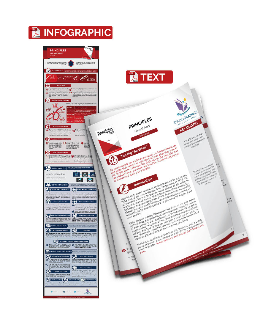 • The insights on Work Principles, so you can align your work with your passions, and to do it with people you want to build a future with. In particular, learn 16 key principles to (i) build a great culture, (ii) find great people and fit them in the right roles, and (iii) build/evolve machines to consistently achieve your goals.