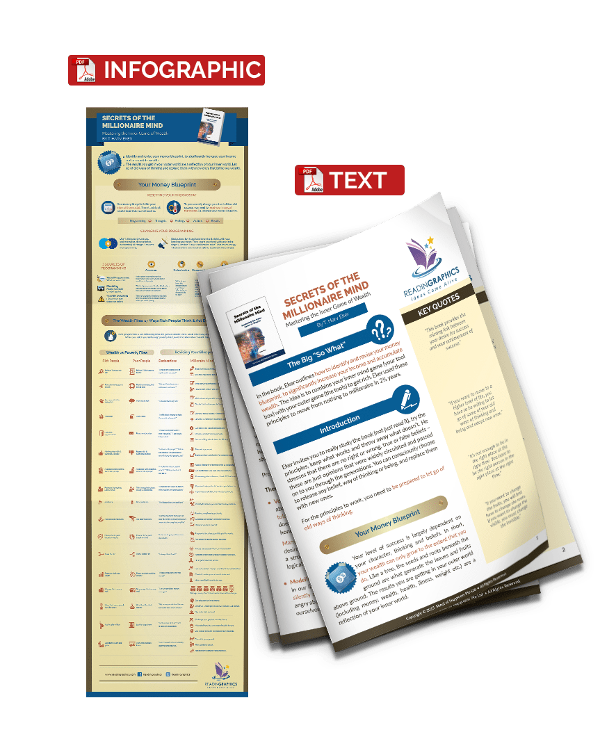In this book, Eker outlines how to identify and revise your money blueprint, to significantly increase your income and accumulate wealth. Using these principles, Eker personally moved from nothing to millionaire in 2½ years. The idea is to combine your inner mind game (your tool box) with your outer game (the tools) to get rich.