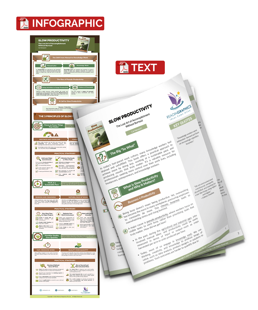 • How to adopt Slow Productivity with 3 key principles and specific strategies to: Focus on fewer priorities that matter, work at a sustainable pace, and prioritize quality over quantity.