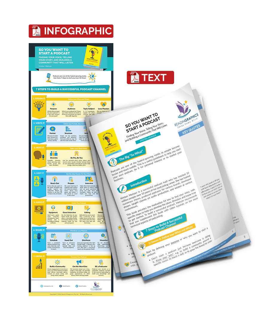 • The 7 steps to creating your own podcast channel, including how to: define your whys and whats, decide on your podcast format, structure and content, select your ideal host(s), get the ideal guests on your show, create a quality podcast, distribute the podcast and promote/grow the channel.