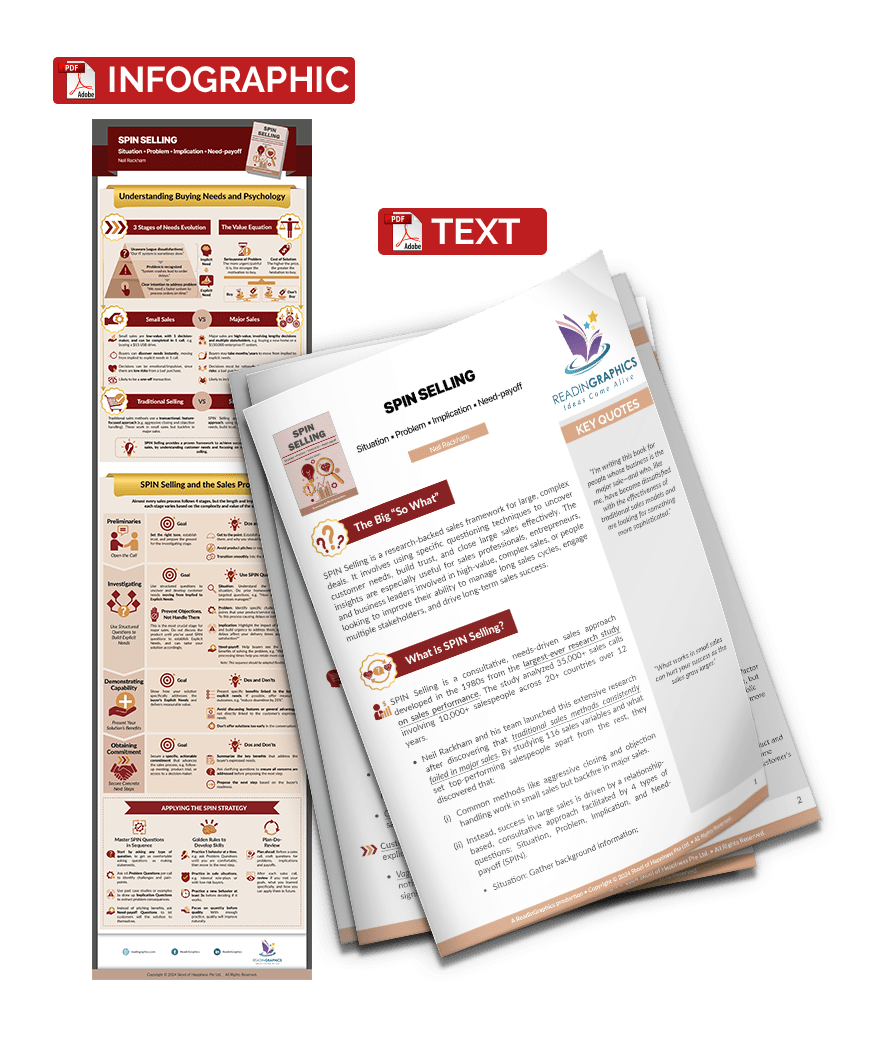 Did you know that traditional sales tactics often backfire in major sales involving larger investments and multiple stakeholders?  This book explains why success in large sales can be significantly improved using SPIN Selling—a consultative, needs-driven sales methodology developed from the largest-ever research study on sales performance.