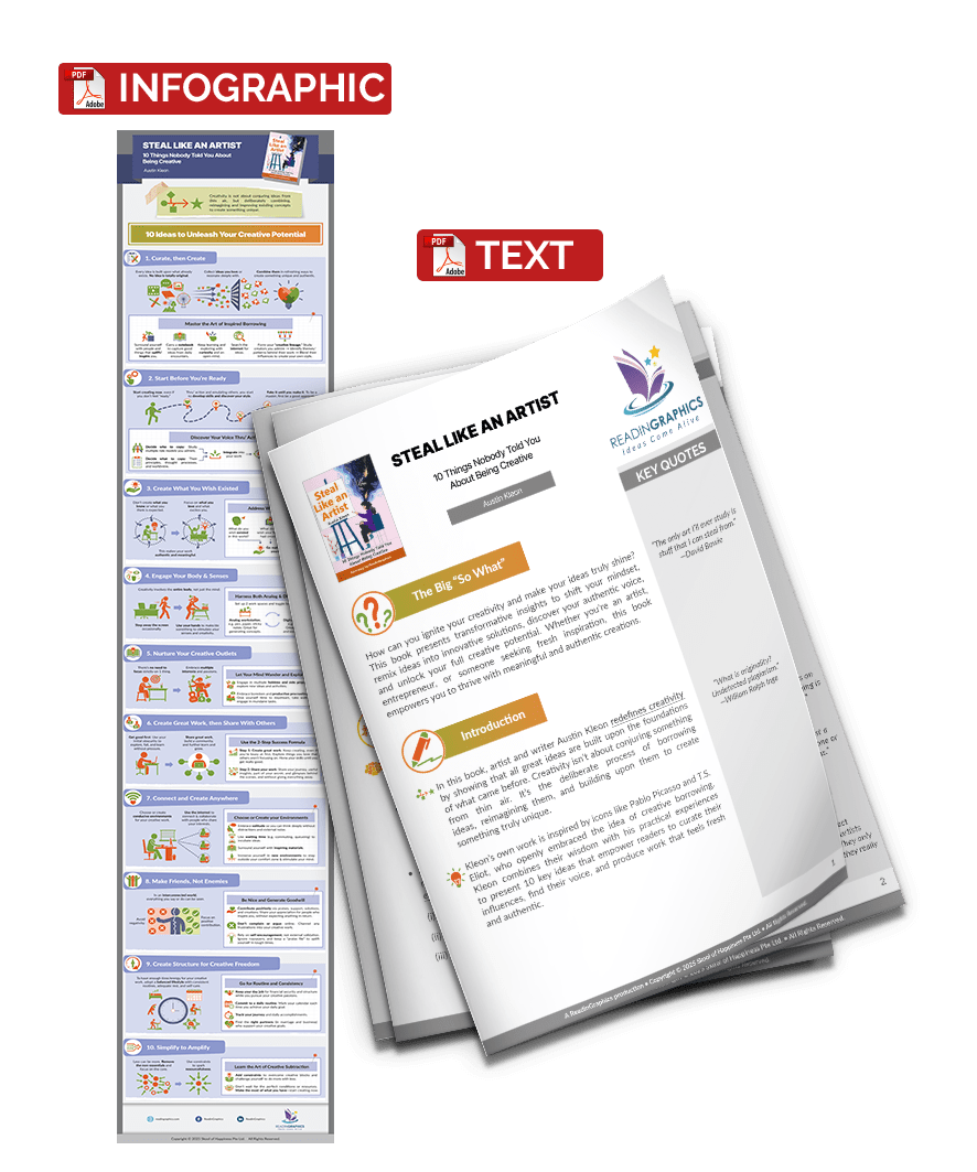 Do you sometimes wish you could be more creative? The truth is, creativity doesn’t require you to be a genius, nor do you need to conjure things from thin air. In this book, artist and author Austin Kleon shares the art of “inspired borrowing”, with 10 big ideas on how to borrow ideas, reimage and improve them to create something truly unique and meaningful.