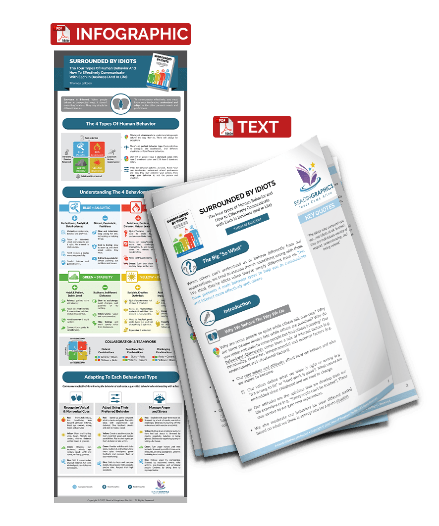 When someone cannot understand you or behave in totally unexpected ways, you may assume there’s something wrong with them. You may even think that they are complete idiots! The truth is, they’re likely to be just different from you. In this book, Thomas Erikson builds on the well-known DISA or DISC personality profiling framework to explain how to recognize and communicate with 4 key behavioral types. He uses 4 colors—Red, Yellow, Green, and Blue—to bring these behavioral profiles to life.