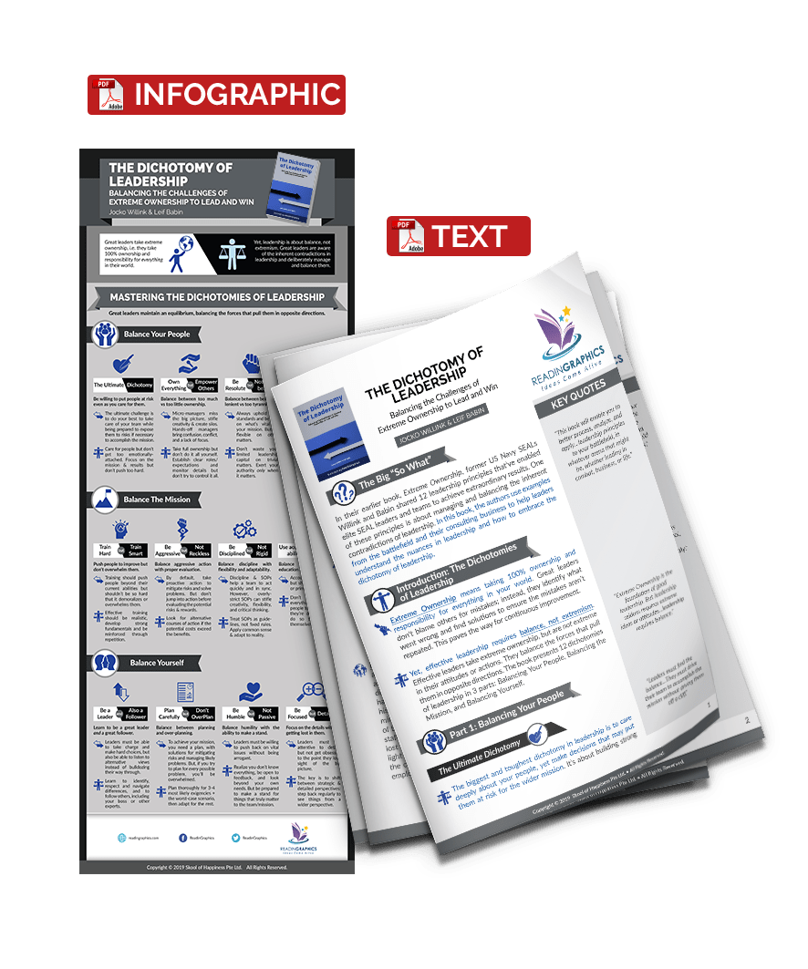 In the book “Extreme Ownership”, former US Navy SEALs Jocko Willink and Leif Babin, shared the leadership principles that enabled enabled SEAL leaders and teams to achieve extraordinary results. Extreme Ownership means taking 100% ownership and responsibility for everything in your world. Yet, great leadership requires balance, not extremism. Effective leaders take extreme ownership, but are not extreme in their attitudes or actions. They balance the forces that pull them in opposite directions. This book helps leaders to understand the nuances and contradictions in leadership, and how to embrace the dichotomy of leadership in 12 key areas to achieve success in various aspects of business and life.