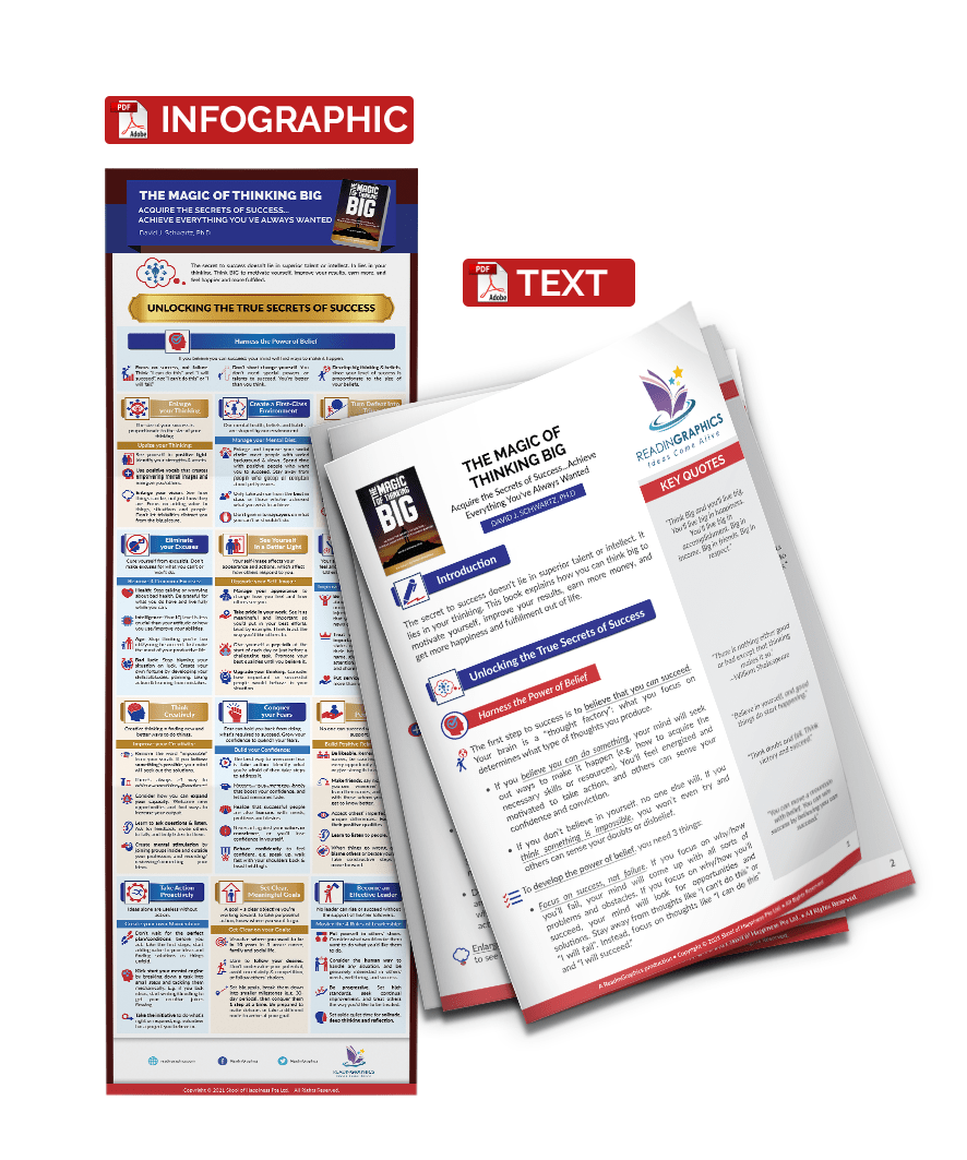In this summary, you’ll learn 13 powerful principles for attaining bigger successes, including how to: Harness the power of belief, enlarge your thinking, eliminate your excuses, conquer your fears, think creatively, see yourself in a better light, create a first-class environment, improve your attitude, treat people right, take action proactively, turn defeat into triumph, make progress with clear/meaningful goals, and be an effective leader.