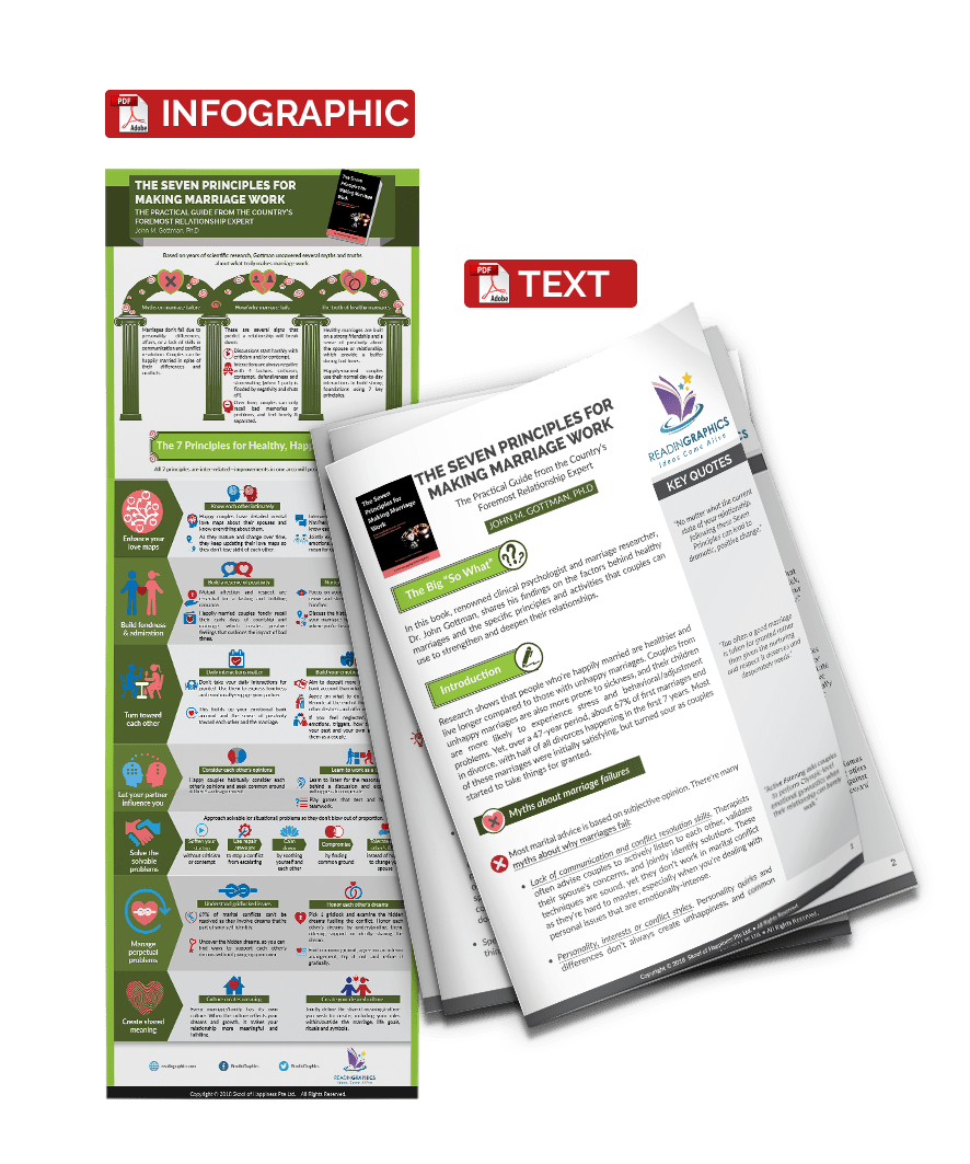Based on decades of scientific research, Dr John Gottman has identified 7 principles for behind happy marriages, and tested them through a series of workshops and real-life applications. This is a detailed guidebook in which he explains the myths of marriage failure, the truth behind marital success, and the seven principles for making marriage work. The book provides a blend of concepts, empirical research, and step-by-step activities that any couple can use to strengthen their foundation of their marriage.