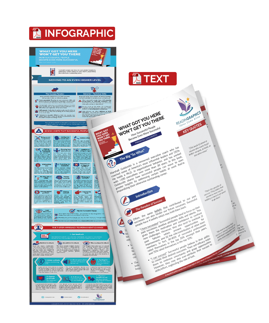 In this book, executive coach Marshall Goldsmith shares how successful people can move to even greater heights by addressing certain habits at work that’re jeopardizing their otherwise-outstanding career. After working with more than 100 executives over more than 30 years, Goldsmith found that the same beliefs that contributed to our past successes can also hinder our future successes. And, most successful people have 1-2 annoying interpersonal or leadership behaviors that’re keeping them from the next level. By becoming aware of these habits and making a decision to stop them, you can achieve even greater levels of success and impact.