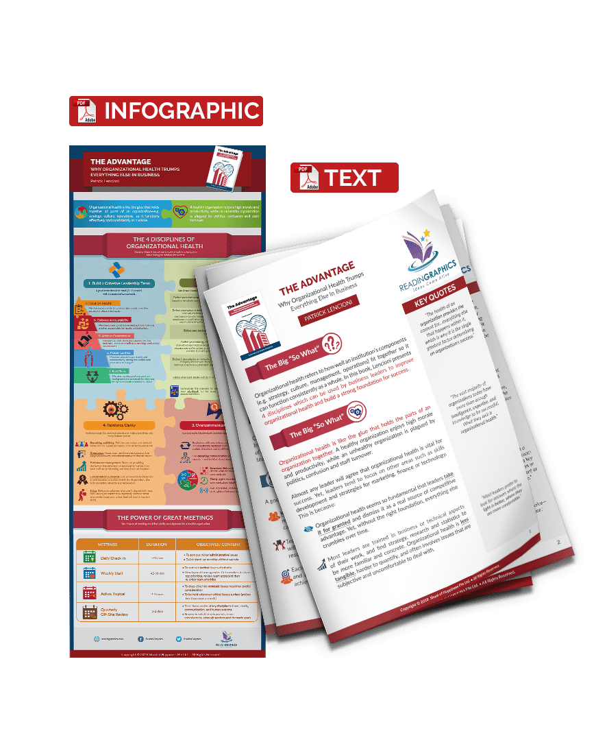Organizational health is like the glue that holds the parts of an organization together; it determines how well an institution’s components (e.g. strategy, culture, management, operations) fit together so it can function consistently as a whole. A healthy organization enjoys high morale and productivity, while an unhealthy organization is plagued by politics, confusion and staff turnover. This is a guidebook that explains the 4 disciplines that can be used by business leaders to improve the health of any organization.