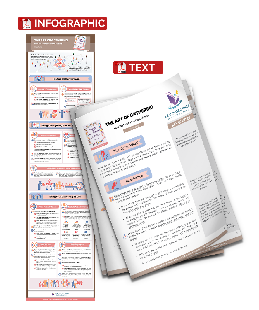 Why do so many events and get-togethers fail to leave a lasting impression or impact? This book presents Priya Parker’s tried and tested ways to design truly meaningful gatherings that connect and inspire people, whether it’s a meeting, dinner, or celebration.