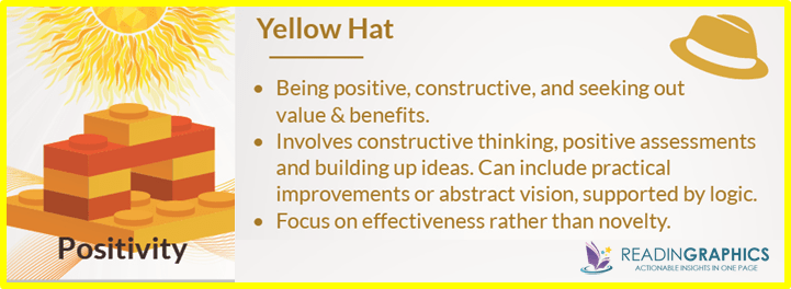 The book actually covers not just two, but six hats or perspectives, all of which have a role to play in developing robust decisions and plans. Read more in our Six Thinking Hats summary.