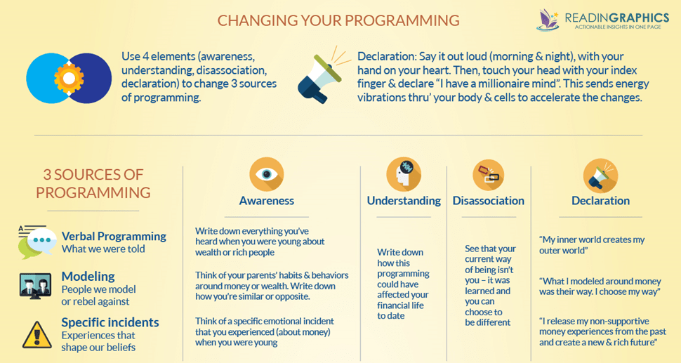 How can you actually go about resetting your financial themostat? Well, Eker outlines 3 areas of Programming (Verbal, Modelling, and Specific Incidents) that we need to address, using a 4 step process (developing awareness, understanding, disassociation, and declarations). Here’s a quick overview: