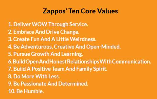 At Zappos, “delivering wow through service” is right at the top of their list of 10 core values, supported by fun, creativity, constant learning, passion etc. These values are printed on the back of every employee ID badge and in their Culture Book; People are hired for these core values; Employees are openly discussing and sharing stories that bring these values to life; “Heroes” who exemplify these values are recognized and celebrated…. you get the drift.