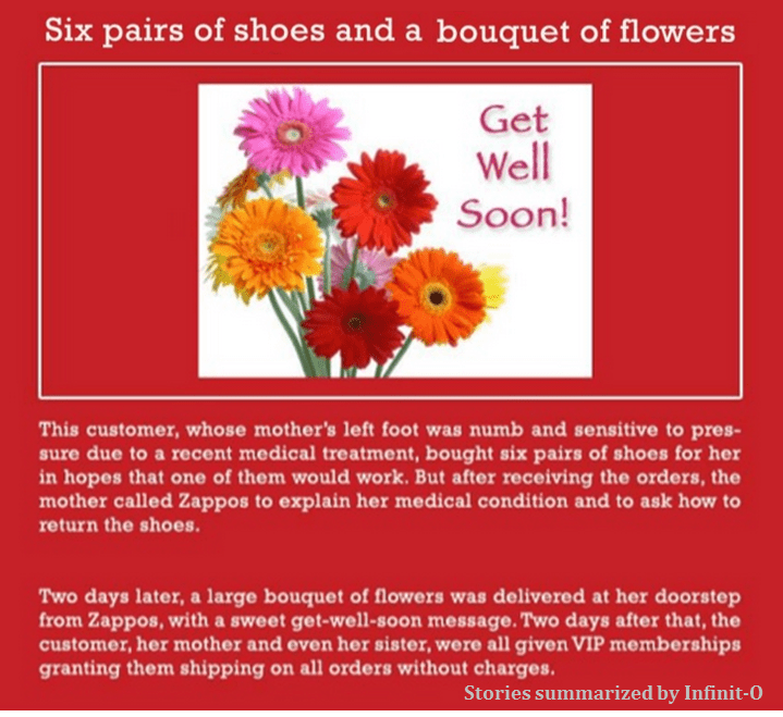 There are so many stories from Zappos, but these are 3 of our favourites (thanks to Infinit-O for putting together some of these examples in easy-to-read slides).